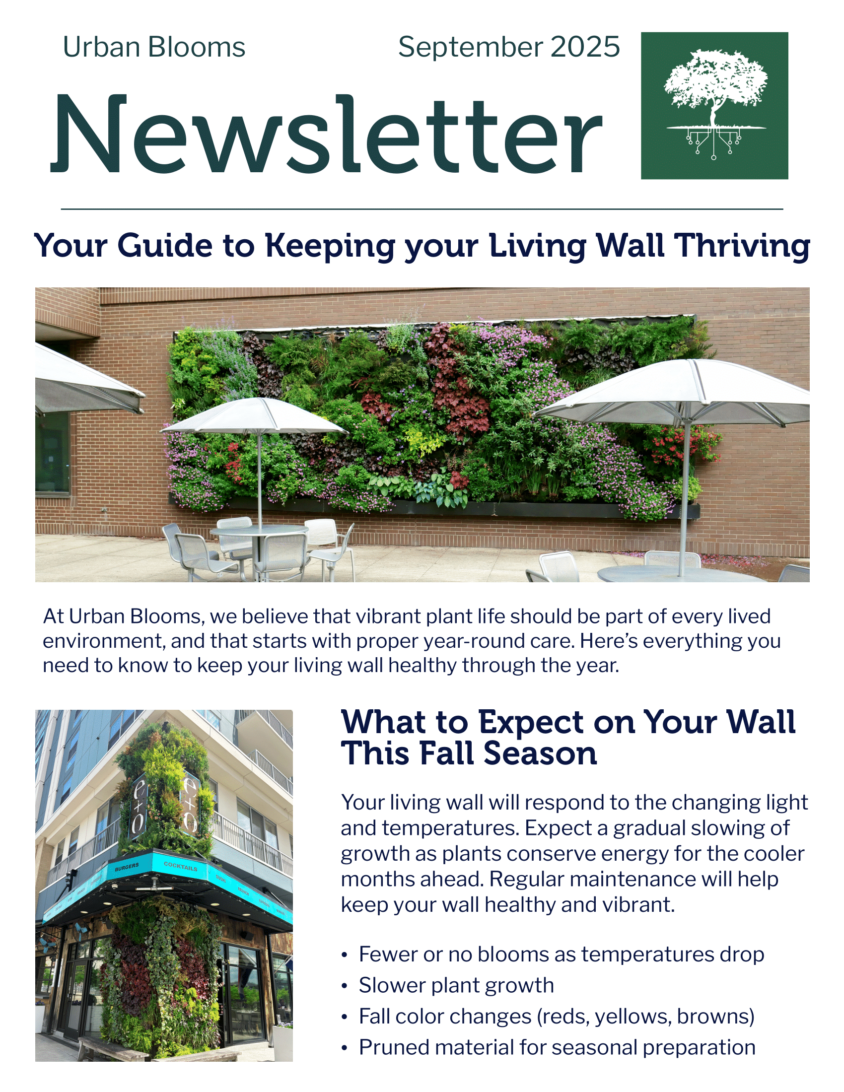 Preview Access the Fall 2025 Newsletter: Download PDF Join the Urban Blooms Newsletter Today! Keep your green space thriving with advice delivered right to your inbox. Get expert tips on how your living wall changes throughout the year and what to expect each season. Email Address Sign Up We respect your privacy. Thanks for signing up! We can’t wait to share seasonal tips to keep your living wall thriving.